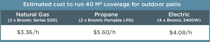 Les coûts de fonctionnement varient selon le modèle et la puissance (en watts pour l’électricité et en BTU pour le gaz). En général, le gaz naturel est le moyen le plus économique de chauffer une terrasse, suivi par l’électricité et le propane. Vous trouverez ci-dessous une estimation du coût de chauffage d’une terrasse de 20 m2 avec la gamme de chauffages de terrasse Bromic.